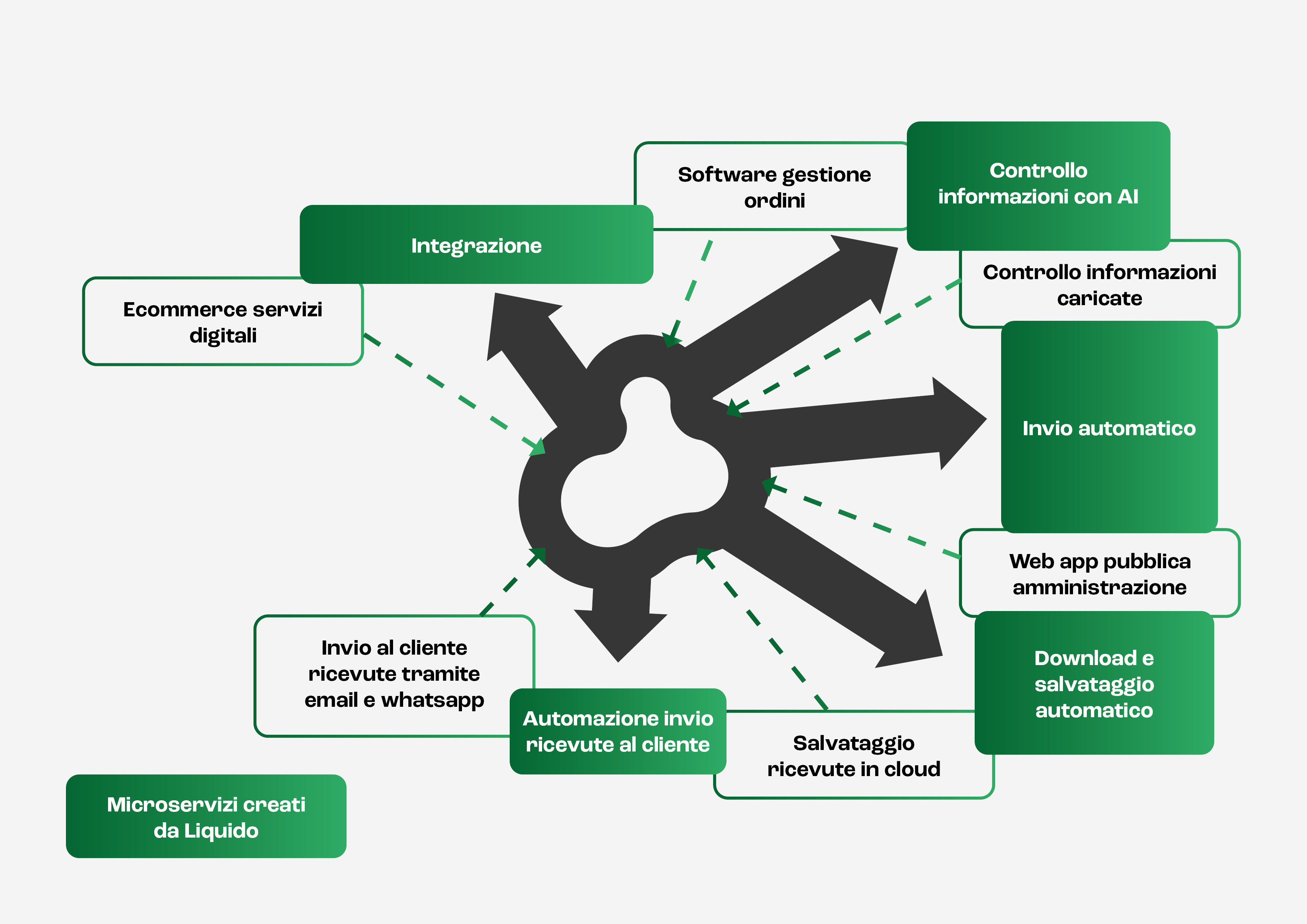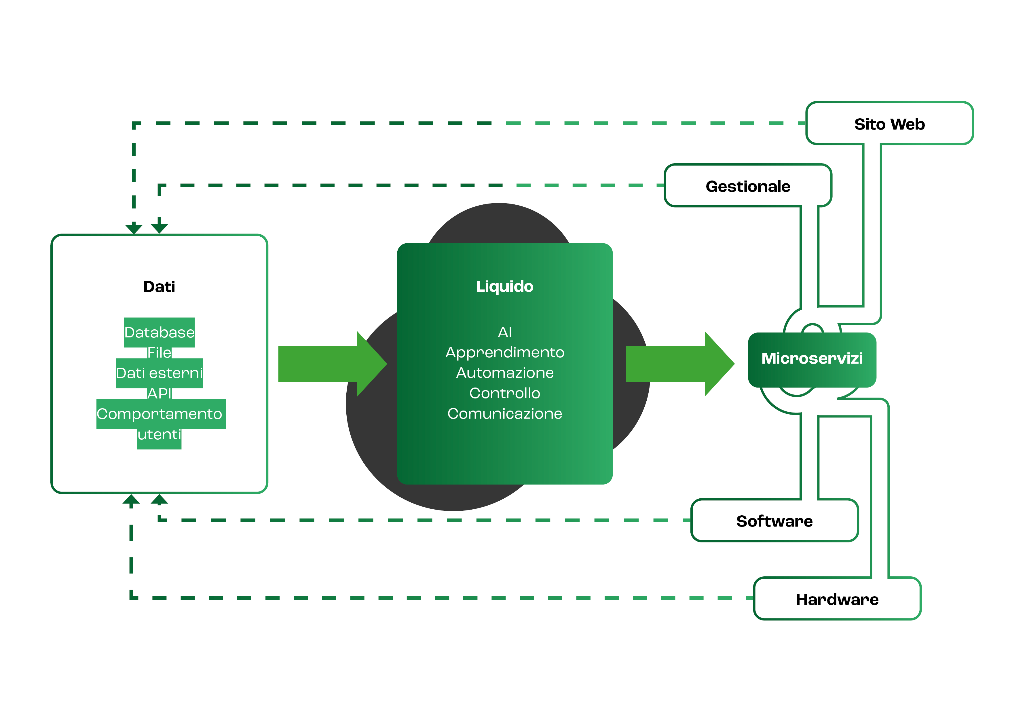 Liquido si adatta, controlla e ottimizza l'ecosistema digitale utilizzando i microservizi. Attraverso l'apprendimento crea automazione tra le attività digitali, attivando o creando nuovi microservizi in autonomia.